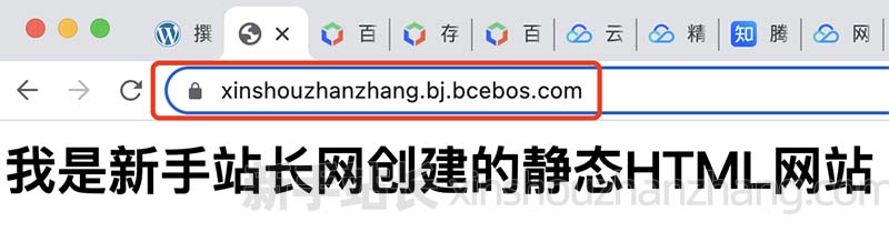 当开启静态网站托管后,使用对象存储BOS生成的官方域名就可以访问了,新手站长带大家来测试一下:
