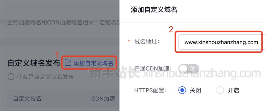 添加自定义域名,域名地址中添加你的域名,然后点确认。