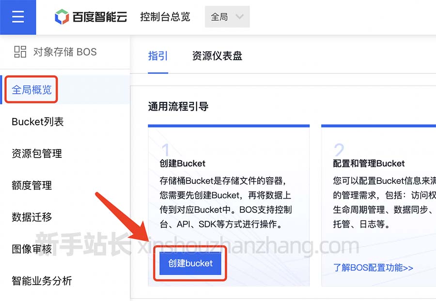 第一次使用对象存储BOS需要先开通一下,然后在对象存储BOS控制台--“全局概览”页面,点击创建Bucket,如下图: