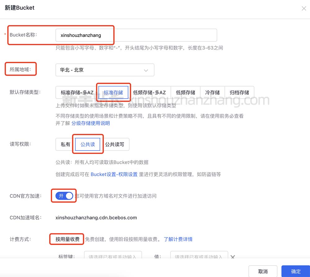 存储类型可选标准存储-多AZ、标准存储、低频存储-多AZ、低频存储、冷存储和归档存储(参考:对象存储BOS存储类型说明),新手站长选择“标准存储”。