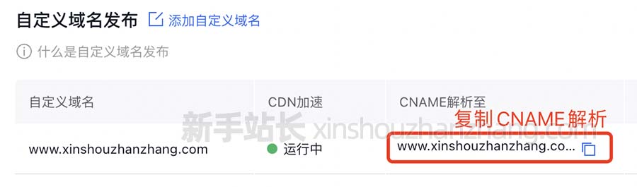 复制生成的CNAME解析值,然后去域名端添加CNAME解析。关于域名解析新手站长就不多赘述了,官方文档中有说明,新手站长给大家整了不同域名注册商的域名解析教程,大家自行参考即可: