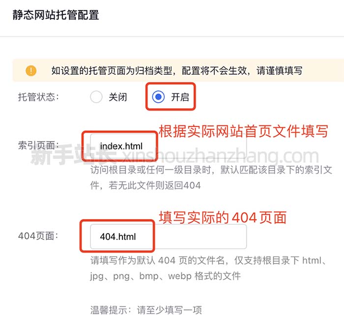 静态html文件上传后,在“配置管理”--“高级配置”中,找到“静态网站托管”功能,然后点“修改配置”,如下图: