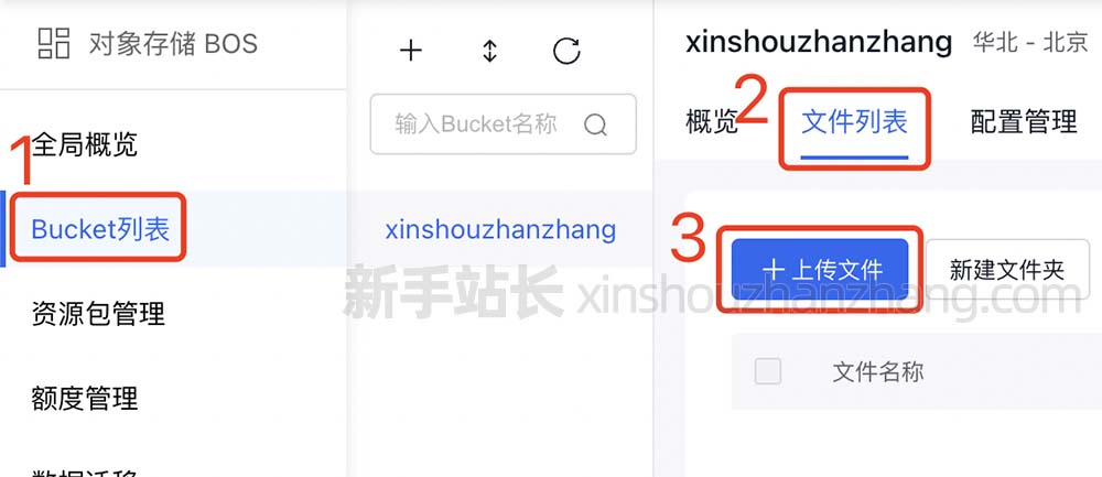 选择左侧的“Bucket列表”--“文件列表”--“上传文件”,将自己准备好的HTML静态网站上传到Bucket中,如下图: