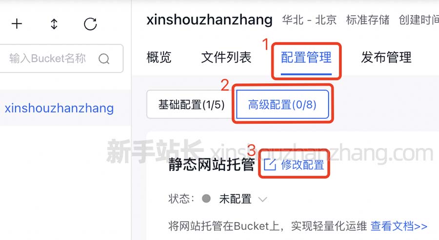 新手站长网把用于测试的index.html文件上传到Bucket中。