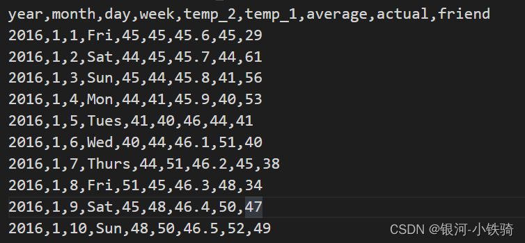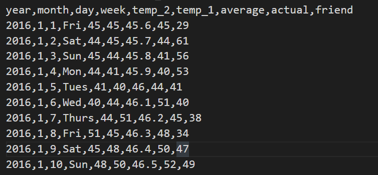 1、csv文件:(部分数据展示) 需要的数据:年-月-日、temp_2(昨天最高气温)、temp_1(金今天最高气温)、average(历年同日最高气温平均值)、actual(今天真实的最高气温)