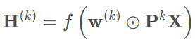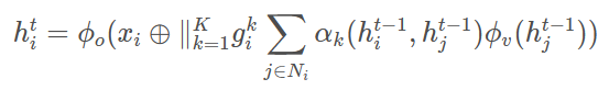 GAAN(Gaan:Gated attention networks for learning on large and spatiotemporal graphs,2018)也利用multi-head注意力的方式更新节点的隐层状态。与GAT为各种注意力设置相同的权重进行整合的方式不同,GAAN引入self-attention机制对每一个head,也就是每一种注意力,计算不同的权重,规则如下: