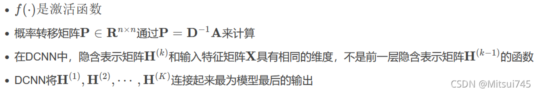 DCNN将图卷积看作一个扩散过程。它假设信息以一定的转移概率从一个节点转移到相邻的一个节点,使信息分布在几轮后达到均衡。DCNN将扩散图卷积定义为