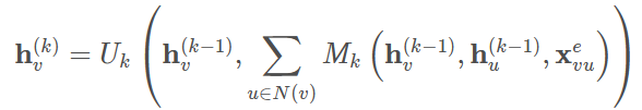 信息传递神经网络(MPNNs)(Neural message passing for quantum chemistry,ICML 2017)概述了基于空间的卷积神经网络的一般框架。它把图卷积看作一个信息传递过程,信息可以沿着边直接从一个节点传递到另一个节点。MPNN运行K-step消息传递迭代,让信息进一步传播。定义消息传递函数(即空间图卷积)为