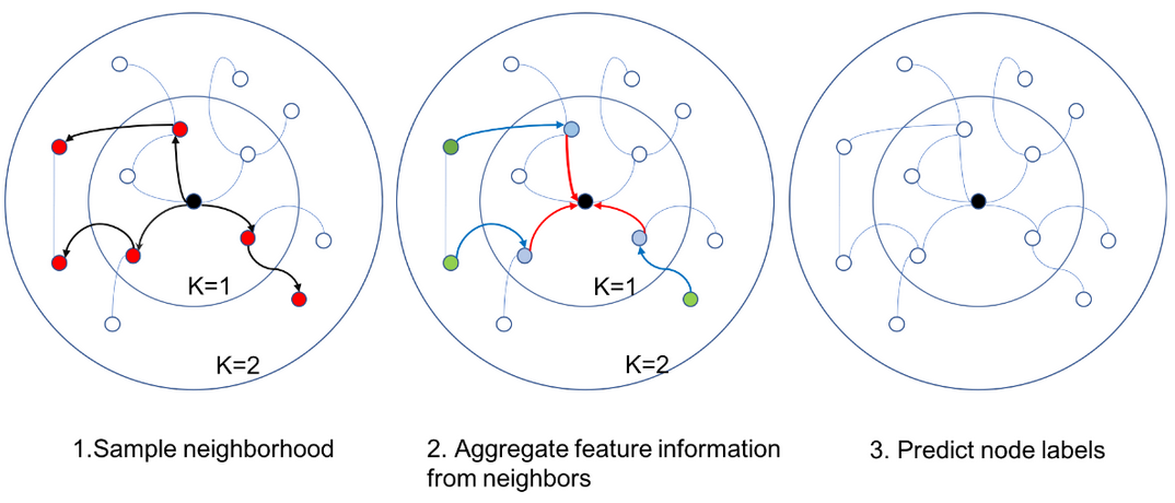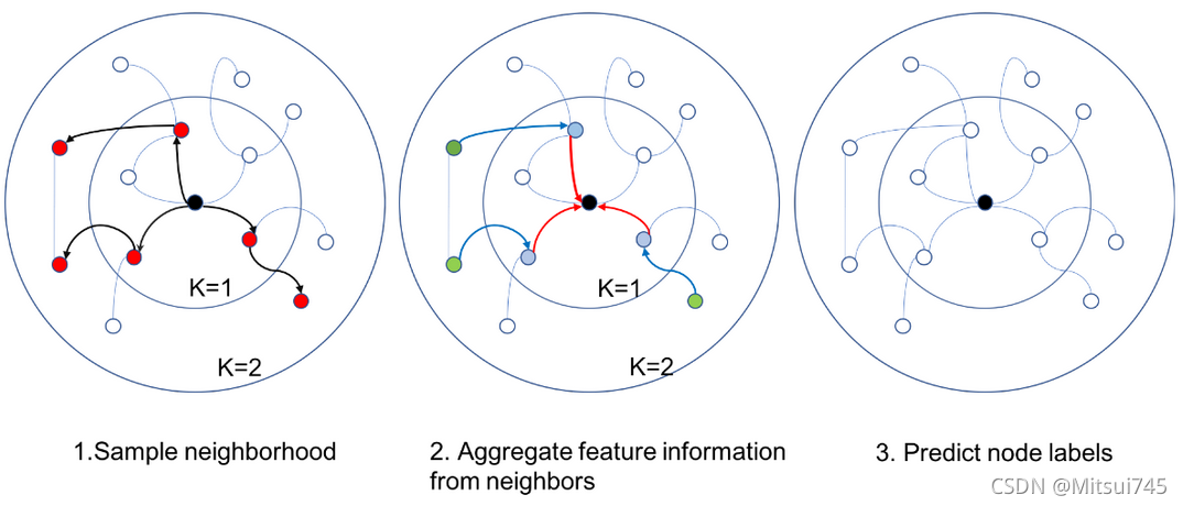 GraphSage没有更新所有节点上的状态,而是提出了一种batch训练算法,提高了大型图的可扩展性。GraphSage的学习过程分为三个步骤。首先,对一个节点的K-跳邻居节点取样,然后,通过聚合其邻居节的信息表示中心节点的最终状态,最后,利用中心节点的最终状态做预测和误差反向传播。如图所示k-hop,从中心节点跳几步到达的顶点。