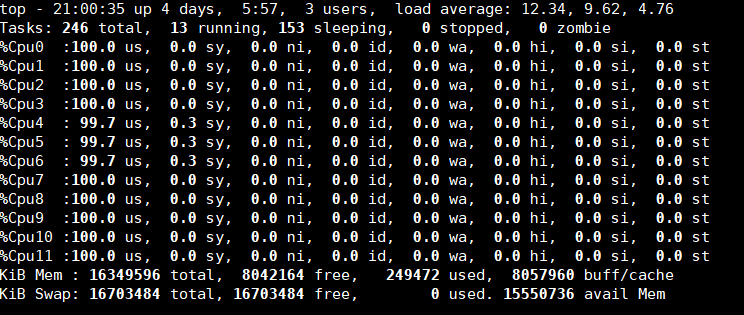 stress: info: [19484] dispatching hogs: 12 cpu, 0 io, 0 vm, 0 hdd$ uptime20:58:45 up 4 days, 5:55, 3 users, load average: 12.43, 8.41, 3.81