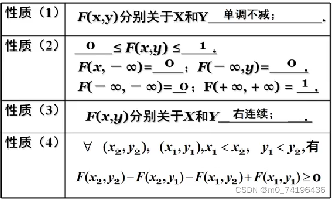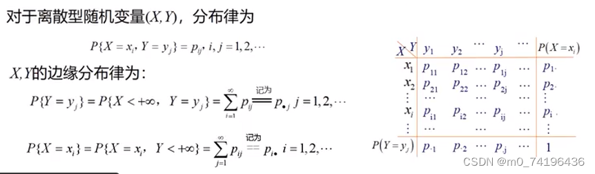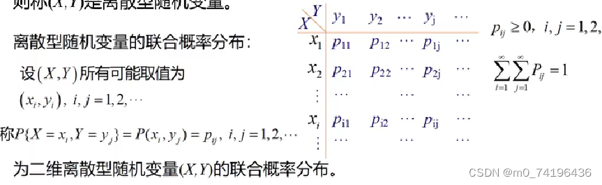 二维离散型随机变量:若二维随机变量(X, Y)全部可能取到的不同值是有限对或可列无限对。则称(X, Y)是离散型随机变量