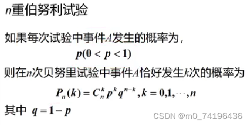 ,在相同条件下,将试验独立的重复进行n次,则称这n次试验所组成的试验为n重伯努利试验或伯努利概型。