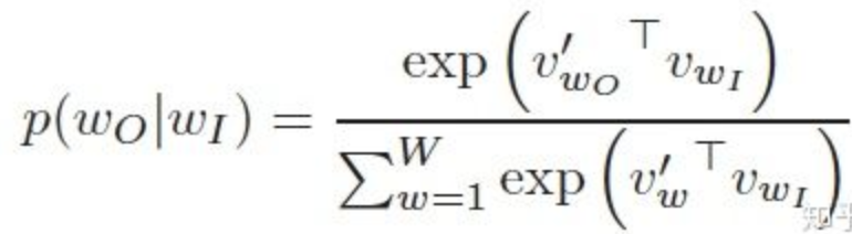 接下来的问题是怎么定义 p(Wt+j|Wt) ,作为一个多分类问题,最简单最直接的方法当然是直接用softmax函数,我们又希望用向量 Vw 表示每个词w,用词之间的距离 ViTVj表示语义的接近程度,那么我们的条件概率的定义就可以很直观的写出。