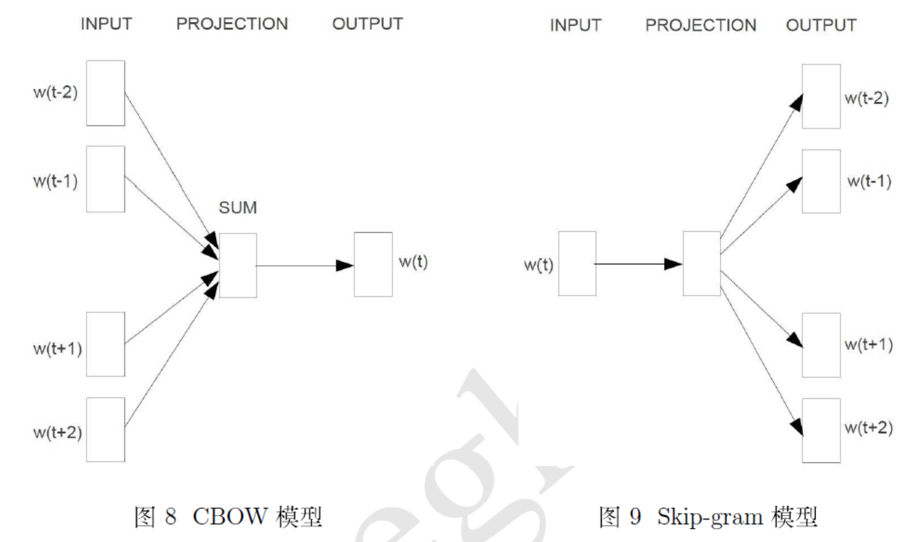 1.从输入层到投影层:前者通过拼接,后者通过累加求和。