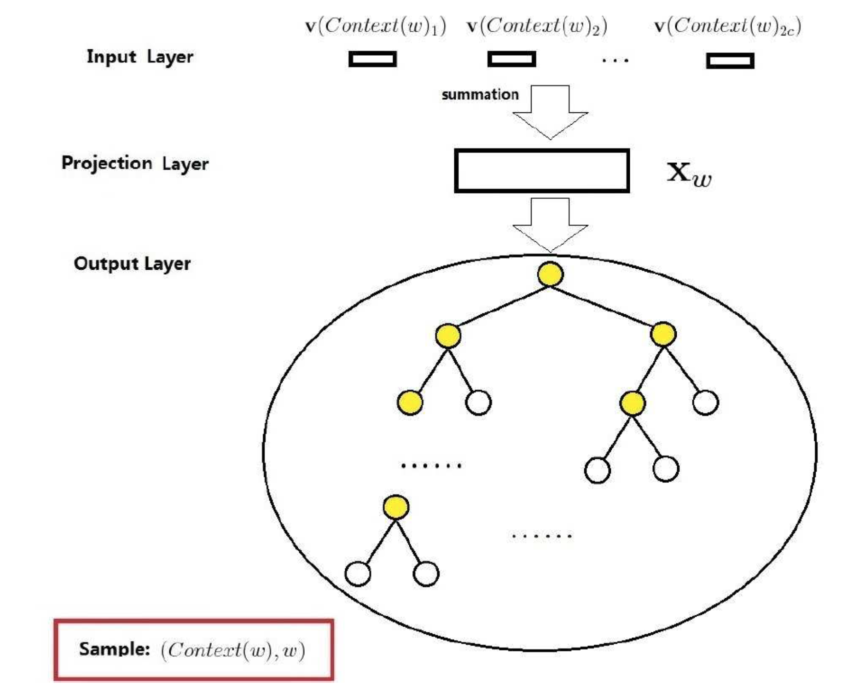 输出层:对应一个二叉树,以语料中出现的词作为叶子节点,已各个词出现的次数作为权值构造出来的huffuman树。