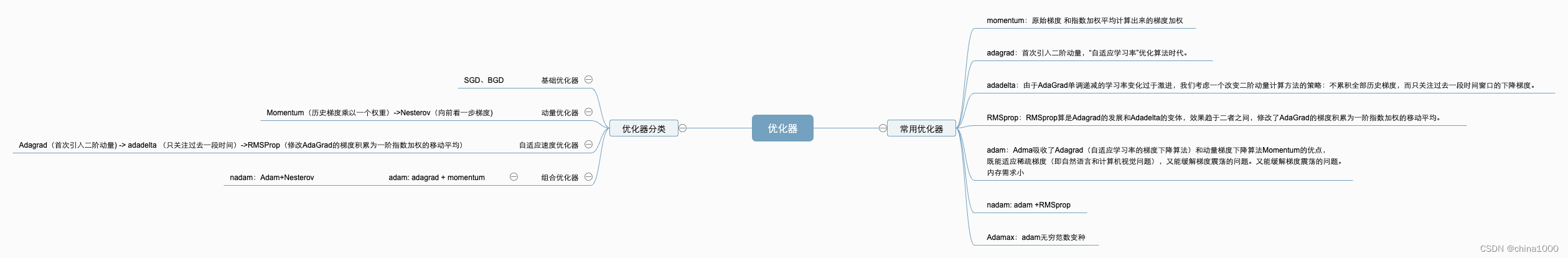 动量优化法:包括标准动量优化方法(MomentumOptimizer)、牛顿加速梯度动量优化方法(NAG, Nesterov accelerated gradient)等;