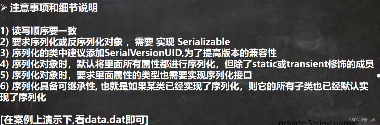 public class ObjectStreamDemo {public static void main(String[] args) throws IOException, ClassNotFoundException { // write();read();} //反序列化private static void read() throws IOException, ClassNotFoundException {ObjectInputStream ois = new ObjectInputStream(new FileInputStream("myOtherStream\\oos.txt"));Object obj = ois.readObject();Student s = (Student) obj;System.out.println(s.getName() + "," + s.getAge());ois.close();} //序列化private static void write() throws IOException {ObjectOutputStream oos = new ObjectOutputStream(new FileOutputStream("myOtherStream\\oos.txt"));Student s = new Student("林青霞", 30);oos.writeObject(s);oos.close();} }