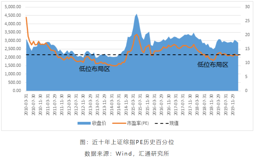 那么,现在的收盘价位于整根K线的20%多的位置,这意味着上证综指非常便宜。在这十年里面,仅有两个区间段,估值是低于当前13倍估值的,一次是13-14年,一次是2018年底,而后面紧跟着的就是14年下半年一直持续到15年中旬的大牛市,以及19年一季度的大幅反弹。所以,以现在历史百分位低于25%的情况看,A股实在是太便宜,后面上涨的概率和空间都比较大。见下图:估值低于黑色虚线的位置,就是比较好的低位布局区。