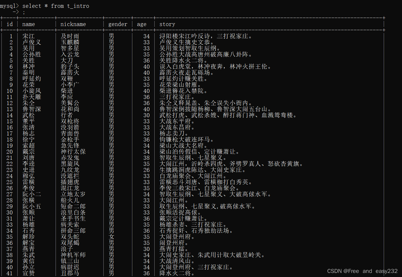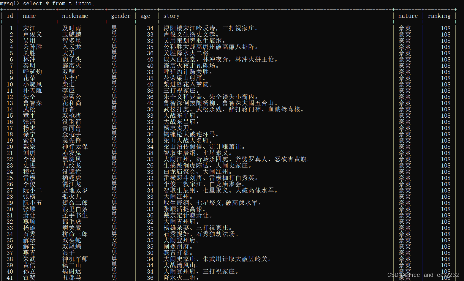 mysql> insert into t_intro values(null,"秦明","霹雳火","男",40,"霹雳火夜走瓦砾场。");mysql> insert into t_intro values(null,"呼延灼","双鞭","男",33,"呼延灼计赚关胜。");