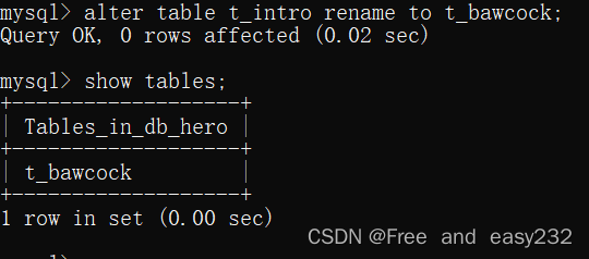 mysql> alter table t_intro rename to t_bawcock;