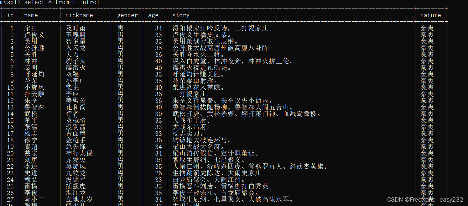 mysql> insert into t_intro values(null,"张顺","浪里白条","男",33,"张顺活捉高俅。");mysql> insert into t_intro values(null,"杨雄","病关索","男",35,"杨雄杀妻、三打祝家庄。");