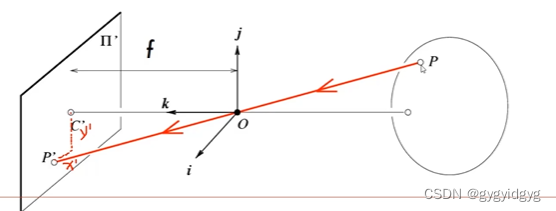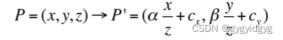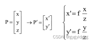 P是相机坐标系中实际的一点,成像P'落在像平面(以中心为原点)中,通过相似三角形,得到对应的映射关系