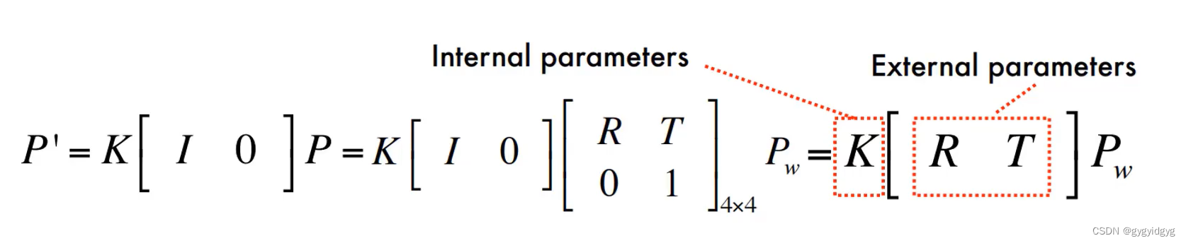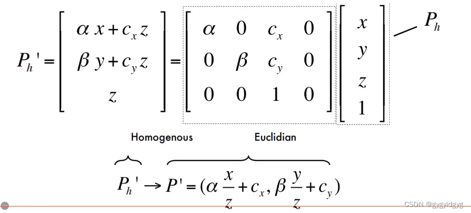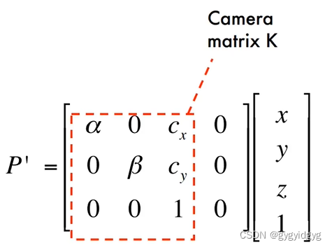 根据在齐次坐标中得到的对应关系的变换矩阵可以定义相机内参,即matrix K。