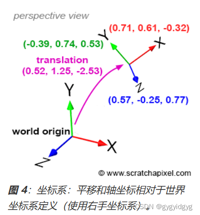 该坐标系是一种约定,用于定义 0D 虚拟空间中的坐标 [0,0,3] 和彼此正交的三个单位轴(图 4)。它是 3D 场景的本初子午线 - 场景中的任何其他点或任意坐标系都是相对于世界坐标系定义的。定义此坐标系后,我们可以创建其他笛卡尔坐标系。与点一样,这些坐标系的特征是空间中的位置(平移值),但也具有彼此正交的三个单位轴或矢量(根据定义,这就是笛卡尔坐标系)。这三个单位向量的位置和值都是相对于世界坐标系定义的,如图 4 所示。