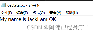 else:with open(r'C:\\Users\\86175\\Desktop\\实验5 文件的操作和异常处理\osData.txt', 'a') as f:f.write('My name is Jack')