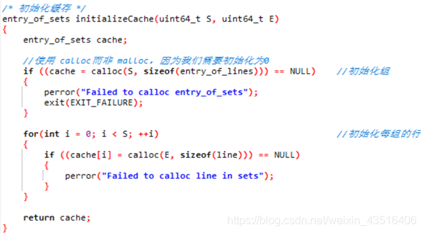 {entry_of_sets cache;//使用 calloc而非 malloc,因为我们需要初始化为0 if ((cache = calloc(S, sizeof(entry_of_lines))) == NULL) {perror("Failed to calloc entry_of_sets");exit(EXIT_FAILURE);}for(int i = 0; i < S; ++i) {if ((cache[i] = calloc(E, sizeof(line))) == NULL){perror("Failed to calloc line in sets");}}return cache;