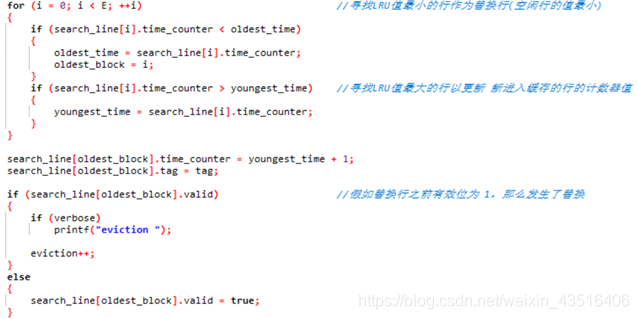 {uint64_t oldest_time = UINT64_MAX; //用于寻找 LRU计数器值最小的行 uint64_t youngest_time = 0; //用于寻找 LRU计数器值最大的行 以 更新替换进入缓存的行的LRU值 uint64_t oldest_block = UINT64_MAX; //记录 LRU计数器值最小的行号 _Bool hit_flag = false;for (uint64_t i = 0; i < E; ++ i){if (search_line[i].tag == tag && search_line[i].valid) //命中 {if (verbose) printf("hit\n");hit_flag = true;++Result.hit;++search_line[i].time_counter; //更新计数器值 break;}}if (!hit_flag) //未命中{if (verbose) printf("miss");++Result.miss;uint64_t i;for (i = 0; i < E; ++i) //寻找LRU值最小的行作为替换行(空闲行的值最小){if (search_line[i].time_counter < oldest_time){oldest_time = search_line[i].time_counter;oldest_block = i;}if (search_line[i].time_counter > youngest_time) //寻找LRU值最大的行以更新 新进入缓存的行的计数器值 {youngest_time = search_line[i].time_counter;}}search_line[oldest_block].time_counter = youngest_time + 1;search_line[oldest_block].tag = tag;if (search_line[oldest_block].valid) //假如替换行之前有效位为 1,那么发生了替换 {if (verbose) printf(" and eviction\n");++Result.eviction;}else{if (verbose) printf("\n");search_line[oldest_block].valid = true;}}return Result;