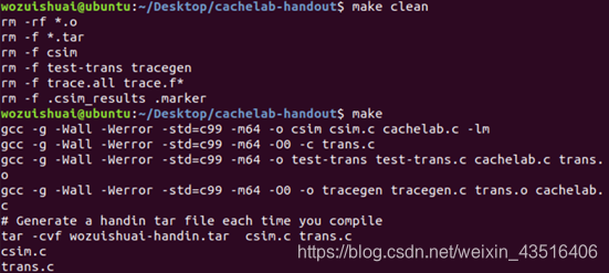 (1)输入make clean后输入make命令编译csim.c,生成可执行文件csim