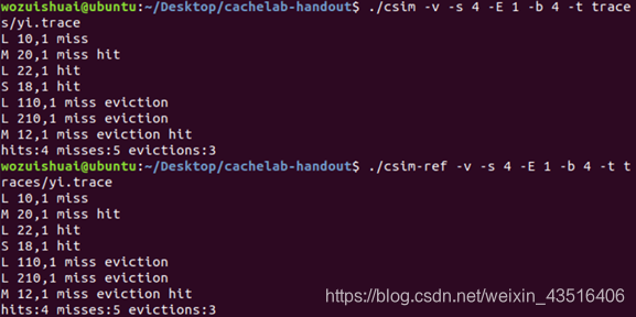 {result Result = {0, 0, 0};char ch;uint64_t address;//读取tracefile中每条访存操作,获取指令及地址,本来可直接忽略读取字节数,但为了打印访存操作,需要记录 //地址是十六进制数,所以采用 %lx 而非 %luwhile((fscanf(tracefile, " %c %lx%*[^\n]", &ch, &address)) == 2) {if (ch == 'I'){continue;}else{uint64_t set_index_mask = (1 << s) - 1;uint64_t set_index = (address >> b) & set_index_mask;uint64_t tag = (address >> b) >> s;entry_of_lines search_line = cache[set_index];// load / store 操作只会引起一次访存操作if (ch == 'L' || ch == 'S'){if (verbose) printf("%c %lx ", ch, address);Result = HitMissEviction(search_line, Result, E, tag, verbose);}/* data modify操作会进行一次 load再对此地址进行一次 store,所以会引起两次访存操作 结果可以为 两次缓存命中, 或 一次未命中(可能包含替换)、一次命中. */else if (ch == 'M'){if (verbose) printf("%c %lx ", ch, address);Result = HitMissEviction(search_line, Result, E, tag, verbose);Result = HitMissEviction(search_line, Result, E, tag, verbose);}else{continue;}}}return Result;