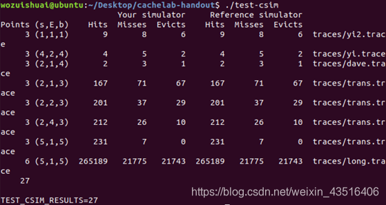 (3)输入./test-csim运行cache模拟器的评价程序,查看得分是否为27分,