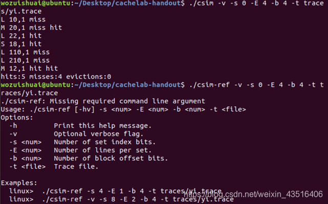 {//这些提示信息是按照.csim-ref的提示信息编写的printf("Usage: ./csim [-hv] -s -E -b -t \n");printf("Options:\n"); printf("-h Print this help message.\n"); printf("-v Optional verbose flag.\n"); printf("-s Number of set index bits.\n"); printf("-E Number of lines per set.\n"); printf("-t Trace file.\n"); printf("\n"); printf("Examples:\n"); printf("linux> ./csim -s 4 -E 1 -b 4 -t traces/yi.trace\n"); printf("linux> ./csim -v -s 8 -E 2 -b 4 -t traces/yi.trace\n");