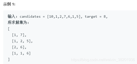 }private void backtracking(List tempCombination, List> combinations,boolean[] hasVisited, int start, int target, final int[] candidates) {if (target == 0) {combinations.add(new ArrayList<>(tempCombination));return;}for (int i = start; i < candidates.length; i++) {if (i != 0 && candidates[i] == candidates[i - 1] && !hasVisited[i - 1]) {continue;}if (candidates[i] <= target) {tempCombination.add(candidates[i]);hasVisited[i] = true;backtracking(tempCombination, combinations, hasVisited, i + 1,target - candidates[i], candidates);hasVisited[i] = false;tempCombination.remove(tempCombination.size() - 1);}}