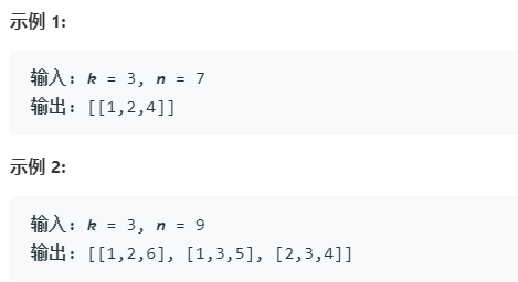 }private void backtracking(int k, int n, int start,List tempCombination, List> combinations) {if (k == 0 && n == 0) {combinations.add(new ArrayList<>(tempCombination));return;}if (k == 0 || n == 0) {return;}for (int i = start; i <= 9; i++) {tempCombination.add(i);backtracking(k - 1, n - i, i + 1, tempCombination, combinations);tempCombination.remove(tempCombination.size() - 1);}
