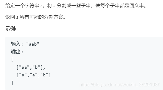 class Solution {List>list=new ArrayList<>();String s;public List> partition(String s) {//从头到尾递归+回溯。this.s=s;//这个是满足的每一个集合Listll=new ArrayList<>();dfs(ll,0);return list;}public void dfs(Listll,int index){if(index==s.length()){list.add(new ArrayList<>(ll));return;}//i从index开始是因为单个字符也是回文子串for(int i=index;i