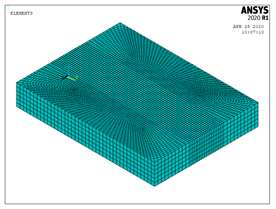 本章中,单元类型设定为solid 70号单元。为了获得更加精确的结果,笔者将移动热源路径附近区域的网格进行细化,其网格尺寸为0.025m,将距离热源轨迹较远的位置的网格尺寸设置为0.05m,不同区域的网格均匀过度,具体划分效果如下图所示。