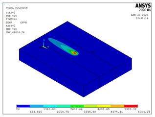 如上图所示,当热源刚加载在钢板上时,钢板模型的最大温度较低,为3922.67℃,到随着热源的移动,钢板的温度快速升高,在很短的时间内会达到一个稳定的范围,并在之后钢板模型的温度保持在较为恒定的范围,随着热源的移动会在6000℃左右有较小的波动。