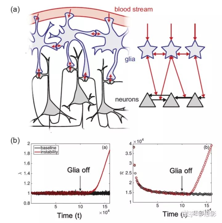 (a)左侧:神经胶质细胞将代谢资源从血流重新分配到神经突触。右侧:双层网络模型。黑色箭头表示神经突触的相互作用。