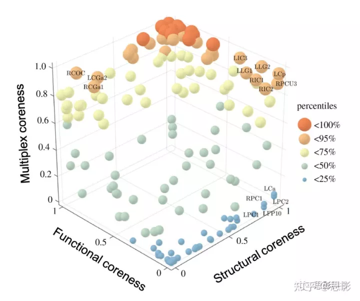 从结构层(DTI)和功能层(fMRI)获得的多层核心与单层核心的散点图。