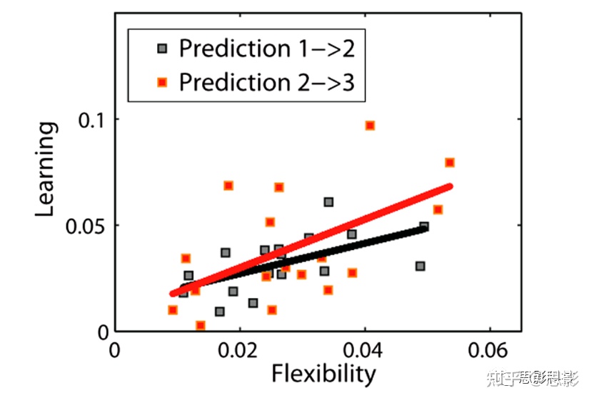 在更大的空间尺度上,Bassett等人(2011)使用多层网络方法来描述人类在简单运动任务中的学习。他们从连续实验过程中的功能磁共振成像信号中建立了颞叶大脑网络。他们使用多重模块化来寻找持久的模块,并发现组织随时间平滑的变化,显示出连贯的时间依赖性。他们的结果还表明,网络灵活性在学习过程中发生了变化(先增加后减少)。特别是,额叶、后顶叶和枕叶区域灵活性更强。此外,他们的结果预测了从一个会话到下一个会话的相对学习量(图10)。
