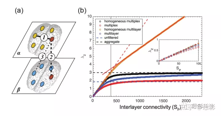 (b)代数连通性λ2作为层间总连通性(Sp)的函数。