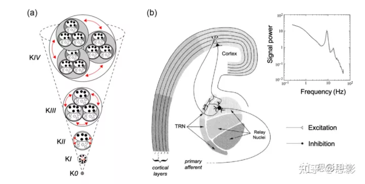 (a)所谓的k层次结构显示了从细胞水平到整个大脑的模型进程。K0是一个不相互作用的神经元集合。KI对应的是具有足够功能连接密度的皮层柱。KII代表兴奋性和抑制性群体的集合。KIII由多个KII集合相互作用形成。KIV是由三个KIII集合相互作用形成的,它们模拟了意图行为的简单形式的起源。