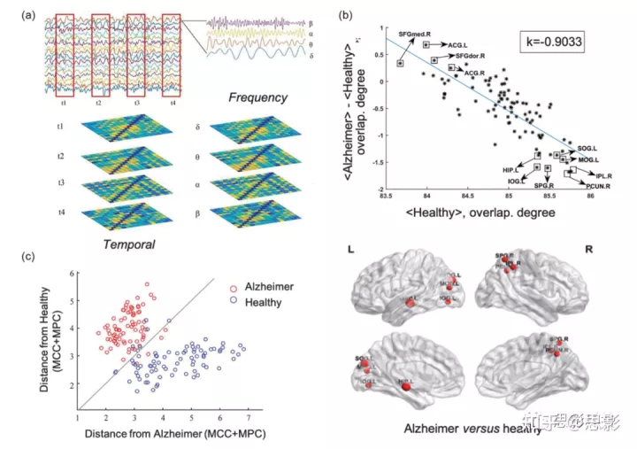 (b)上:阿尔茨海默病患者脑磁图多频网络中枢中断。下:重叠加权程度组间差异显著的脑区。