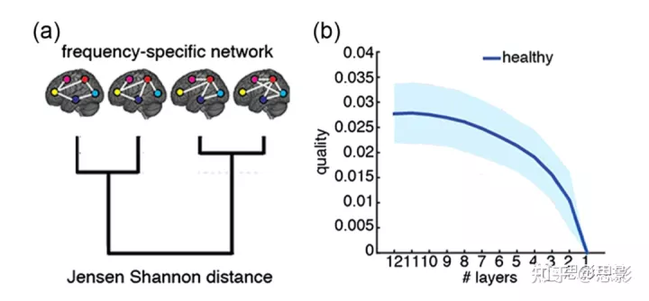 多层网络比标准网络方法提供了更丰富的描述,但它们真的代表着在大脑组织建模方面向前迈进了一步吗?是否所有的层都是捕获主要组织属性所必需的?De Domenico, Nicosia等人(2015)通过引入一种结构可约性方法来解决这些问题,该方法可以使多层网络的层与层之间的非冗余拓扑信息相对于其聚合对应物的数量最大化[图4(a)]。对于大量的网络,从蛋白质相互作用到社交网络,结构可约性表明,从可区分性角度来看,最佳配置不一定是层数最多的那个。相反,由fMRI信号衍生的多频大脑网络不容易约简,因为所有层都带来了一些非冗余的拓扑信息[图4(b)]。