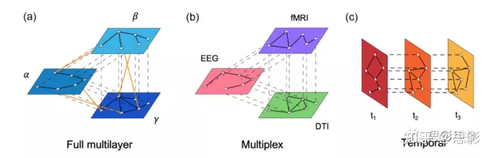 (b)多模态网络。仅允许相同节点之间的层间连接。对层内的连接没有限制。