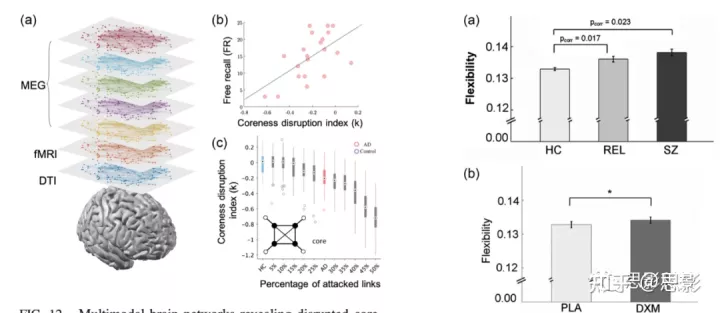 (2)神经精神障碍:在神经精神疾病中,精神分裂症由于其庞大的人口发病率,无疑是研究最多的疾病之一。典型的临床症状包括幻觉、情绪迟钝、言语和思想混乱。在大的空间尺度上,低频和高频神经元振荡,以及它们的相互作用,已被广泛记录为精神分裂症神经病理学的核心特征。De Domenico、Sasai和Arenas(2016)使用多重方法首次从静息态fMRI衍生的多频率网络中提供了精神分裂症拓扑变化的综合表征。他们评估了多重PageRank中心性,并显示了大脑最重要的多频率中枢的大量重组,包括楔前叶皮层,这是大脑基本生理组织的关键区域。在调查时间功能磁共振成像网络时,Braun等人(2016)表明,与健康受试者相比,精神分裂症患者在工作记忆任务中表现出多重网络灵活性的增加,工作记忆任务通常用于评估认知缺陷的神经基础[图13(a)]。Braun等人在实验上阻断另一组健康受试者的谷氨酸敏感突触受体(NMDA受体)时,能够重现同样的超灵活性[图13(b)]。总的来说,这些发现首次表明,精神分裂症患者的微尺度兴奋-抑制失衡实际上可能转化为时间不稳定的、可能解体的大规模大脑重组。