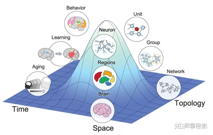 大脑系统的不同组织形式是多维的。这里说明了三种类型的维度或层次,即时间、空间和拓扑。从上到下,各个组织层次的尺度从微观到宏观。